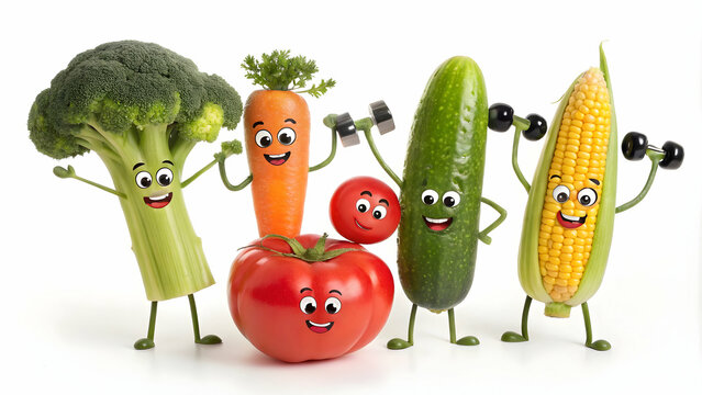 funny cartoon characters smiling, vegetables on shelves, vector illustration, front view