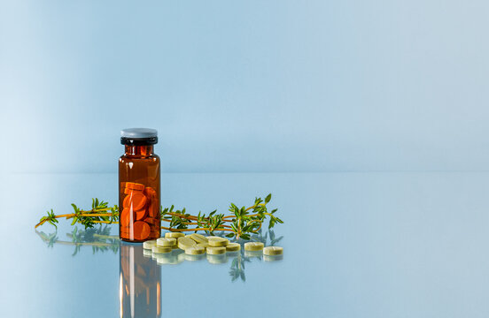 Bottle with natural tablets with extract of medicinal thyme herb.