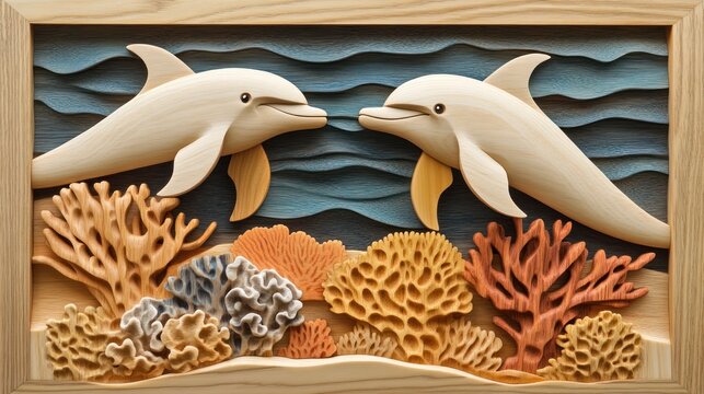Displaying carved reef diorama showing branching coral, carved fish, turtle on turquoise panel
