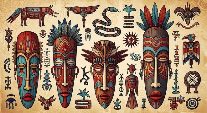 Detailed illustration of tribal masks and ancient symbols evoking cultural heritage and artistry