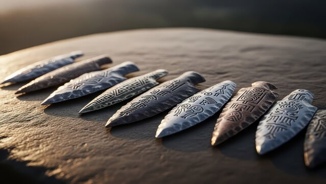 Close-up of eight carved stone arrowheads laid out on a textured surface, sunset lit