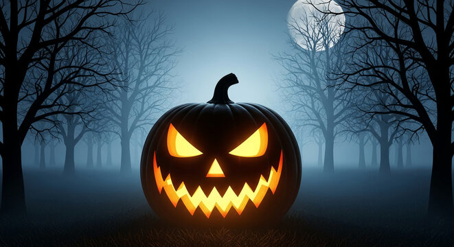 Spooky Halloween pumpkins glowing menacingly on a foggy, eerie path leading into a dark forest, perfect for seasonal decorations and haunted themes