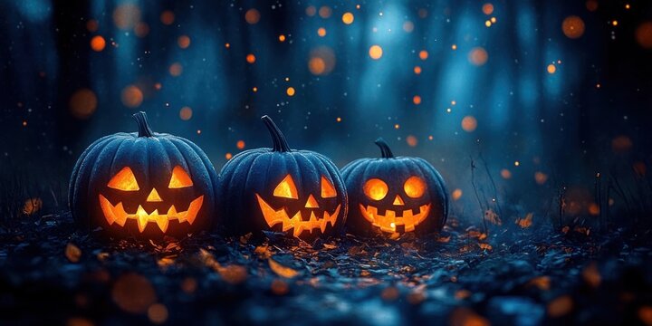 Three glowing carved pumpkins with spooky faces sitting on forest floor surrounded by soft glowing orange lights and misty blue background creating eerie atmosphere