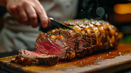 Chef carving a seasoned roast beef on a wooden table