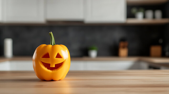 Festive Halloween pumpkin carving with a friendly face, sitting on a kitchen counter. Seasonal decoration for fall and autumn.