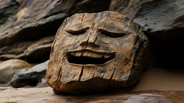 Eroded stone carving of an ancient face with worn smooth features set against a textured rock background