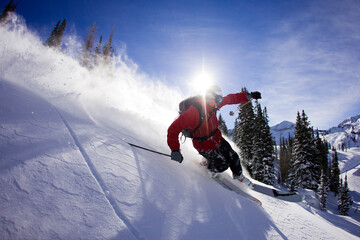 Male telemark skier in Alta, UT carving with blue skies in the background.