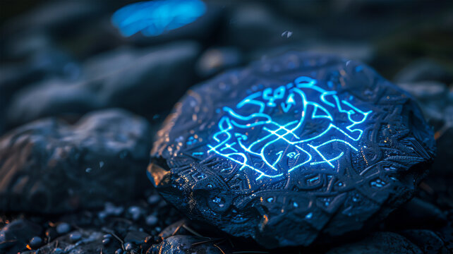 Illuminated stone wall with question mark carving and candles