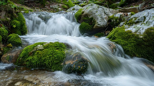 Long Exposure of Mountain Stream with Silky Water and Green Mossy Rocks, Nature Landscape
