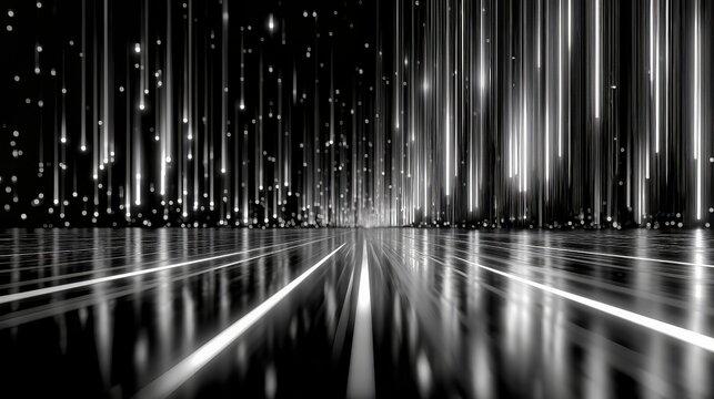 Luminous white particles cascading over glossy black surface, generating dynamic light trails and futuristic technological ambiance for digital design compositions