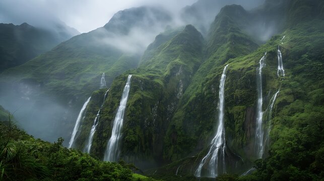 Majestic waterfall cascading down rocky cliff in verdant forest