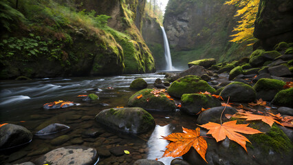 Low angle view of a cascading waterfall in a lush green canyon surrounded by mossy rock, with autumn maple leaf resting on a foreground stone in the flowing river
