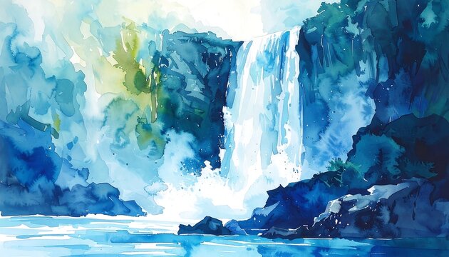 Watercolor landscape depicting cascading waterfall with vibrant blue and green hues amid lush, rocky, forested scenery