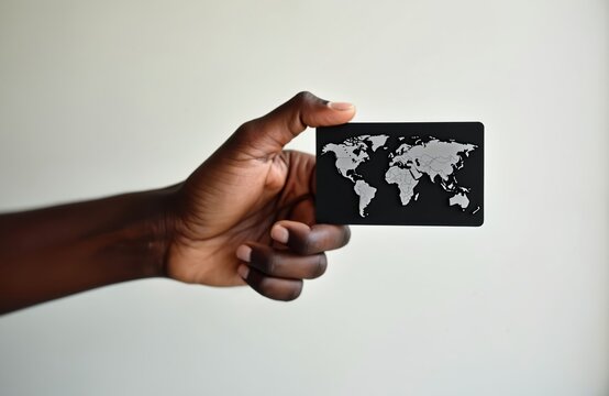 African American hand holds black business card with world map design. Modern finance, global banking concept. Technology, international commerce themes. Card presented against neutral background.