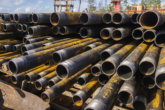 Drilling of oil and gas wells. Drill pipe inspection. Tubing for oil and gas listed on the pedestal out of the wells after washing and ready for inspection. Stack of casing laying on the deck