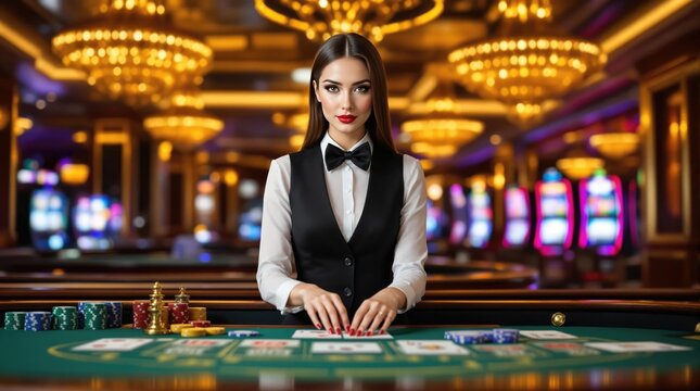 Elegant casino dealer showcasing skills at a luxurious gaming table during an evening event with vibrant lights and atmosphere. Generative AI