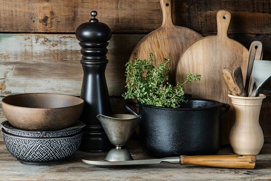 Historical Kitchen Tools hand cranked grinder cast iron pots wooden utensils historical setting