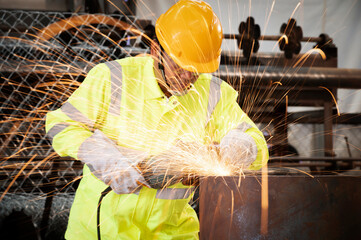 Young manual worker using grinder on metal in factory. Worker grinding in a workshop. Heavy industry factory, metalwork