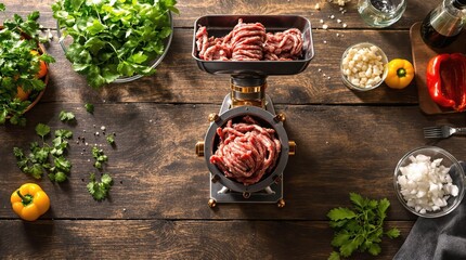 Meat grinder antique cast iron with copper accents on rustic wooden table, freshly processed meat coils, bell peppers, herbs, diced onions in glass bowls, natural light