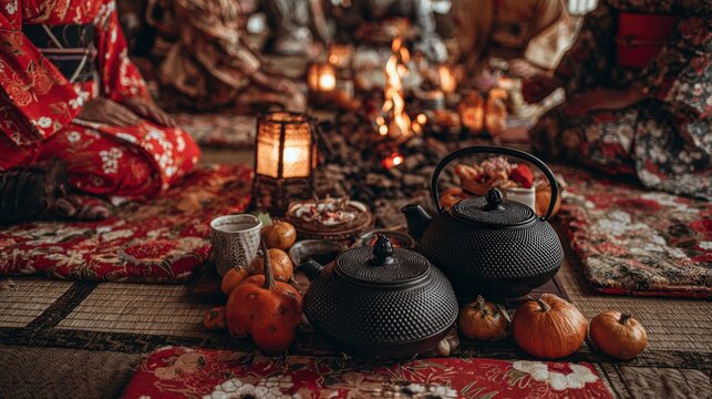 Traditional gathering featuring cast iron kettles and seasonal gourds illuminated by soft lantern light