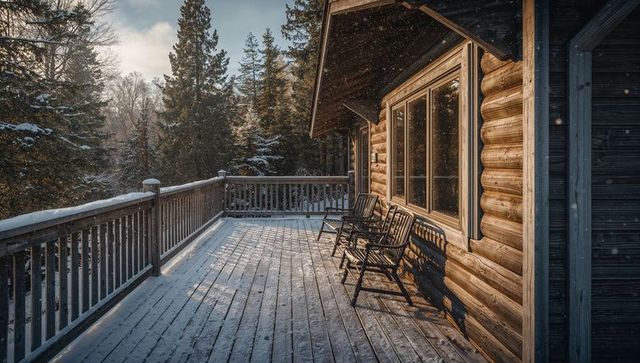 Snow-dusted log cabin deck with chairs casting long shadows at sunrise