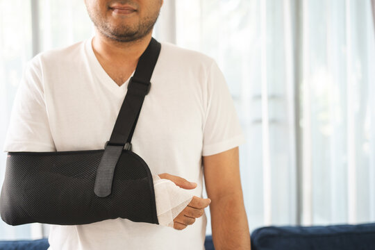 Social security and health insurance concept. Young Man suffer pain from accident fracture broken bone injury with arms splints in cast sling support arm in living room.