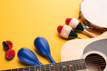 Wooden colorful and blue maracas with tambourine, castanets and acoustic guitar on yellow background