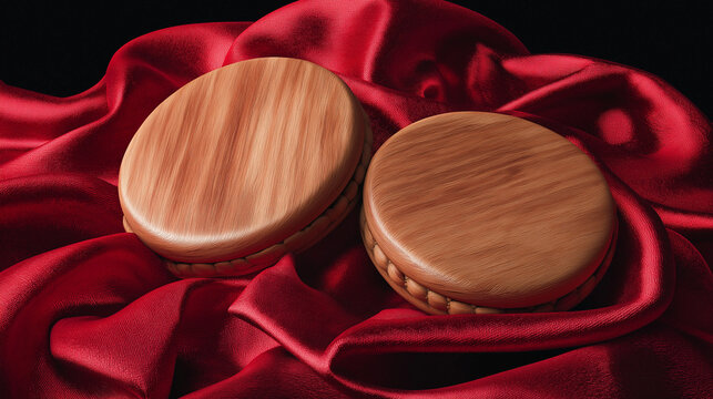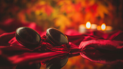 castanets. Traditional castanets resting on crimson silk, glowing with candlelight and autumn foliage behind. representing seasonal cycles and harvest abundance.