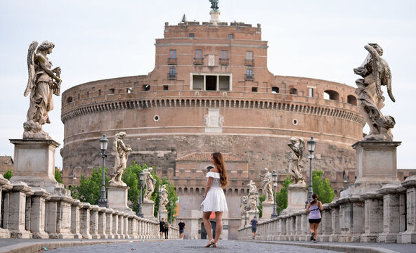 A young girl captures a photo of Castel SantAngelo and a bridge in Rome with her smartphone on a bright sunny day. Rome, Italy