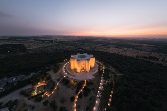 Panoramic aerial view of Castel del Monte at night, Puglia, Italy.