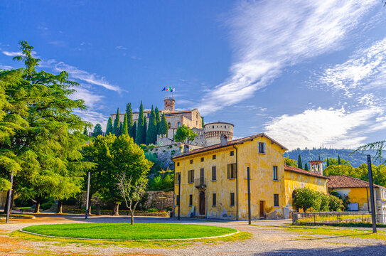Castle of Brescia medieval building or Castello di Brescia or Falcon of Italy on Cidneo Hill with green park in historical city centre, blue cloudy sky background, Lombardy, Northern Italy