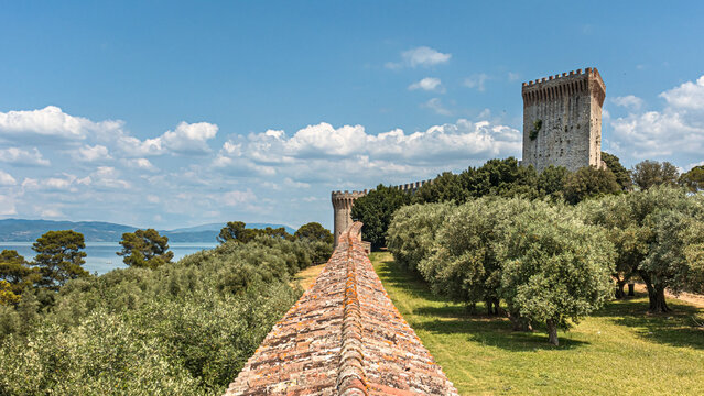 Castiglione del Lago medieval fortress fort in Umbria, Italy Rocca with Medievale o Rocca del Leone tower and lake Trasimeno high angle view in sunny summer day by amphitheater