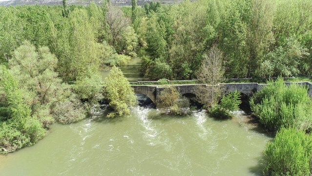 Aerial view of old stone bridge over river in natural area near Palencia Spain