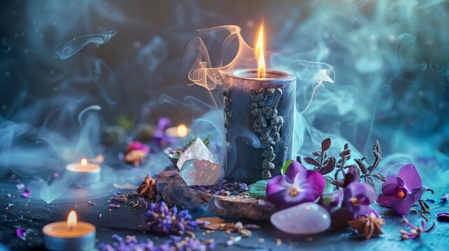 Casting a spell with a black candle, crystals, and herbs, with a mystical...