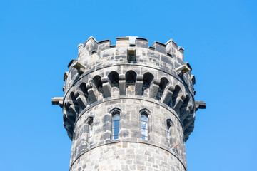 Old medieval castle tower on a hill in the forest in Europe on a bright sunny day