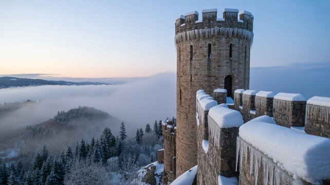 Majestic medieval castle tower covered in snow and icicles above misty valley