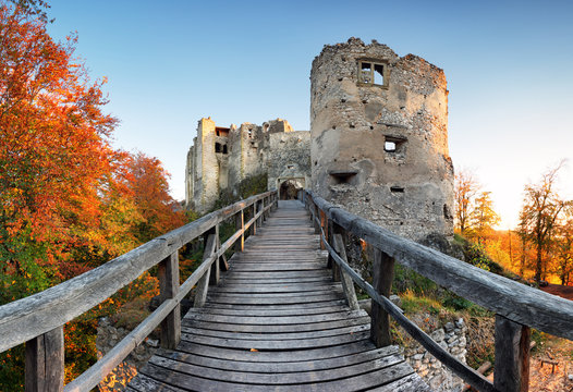 Old medieval castle tower on a hill in the forest in Europe on a bright sunny day