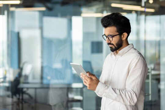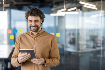 Man in modern office uses tablet. Confident person holds digital device. He smiles in coworking space. Male employee works online. Business person uses tech indoors by the window enjoys sunlight.