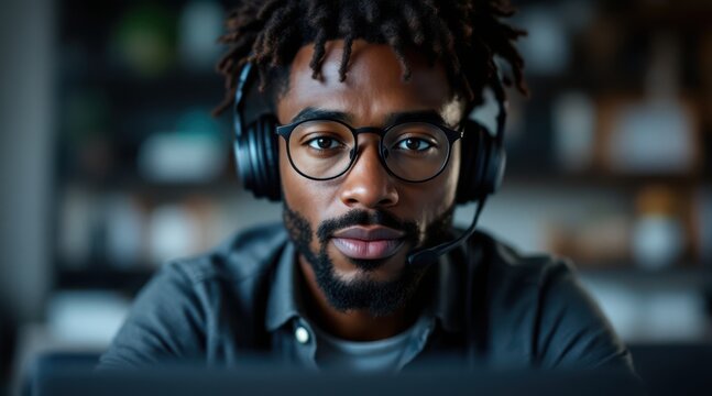black entrepreneur working remotely concept. Focused man wearing headphones in a modern workspace.