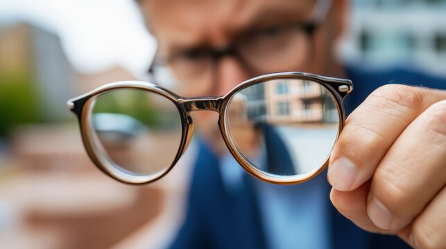 Man holds glasses up to the camera while looking intently at something beyond