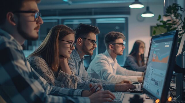 Diverse office team collaborating with technology