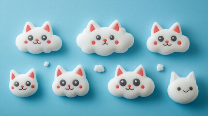 Cute white ghost cat soaring through the sky in an adorable cartoon style against a blue background.