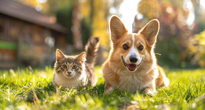 Corgi and cat playing in backyard grass