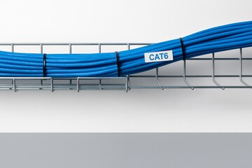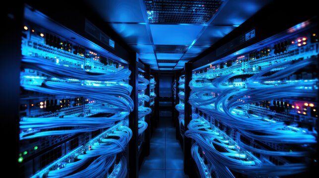 Twisted Pair cables neatly arranged in mainframe room data center rack, modern telecommunications technology internet.