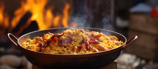 Delicious Iranian pilaf in cauldron at street market.