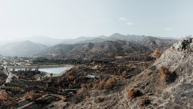 Water reservoir surviving a devastating forest fire near Arakapas village. Limassol District, Cyprus