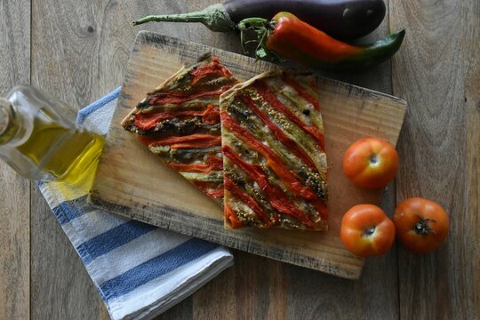 Coca de recapte typical catalan food similar to pizza with vegetables in a wooden table and some vegetables around
