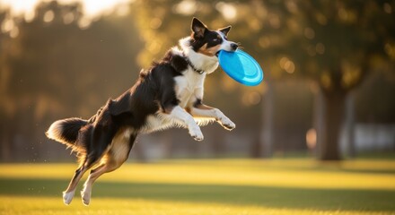Energetic Border Collie Leaps to Catch a Bright Blue Frisbee in a Sunlit Park, Showcasing Joyful Playfulness and Dynamic Action in a Lush Green Setting Filled with Vibrant Nature