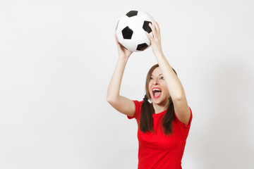 Active European young woman, two fun pony tails, football fan or player in red uniform catching classic soccer ball isolated on white background. Sport play football health, healthy lifestyle concept.