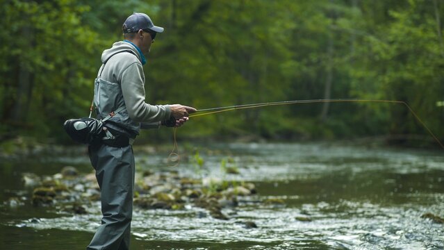 Fisherman catching trout in a mountain river